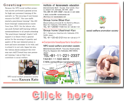 | Corporation summary | The December, 2001 Bibai welfare club Ltd.establishment The May, 2003 NPO social welfare promotion society establishment Change a name of it to the Nanakamado society in August, 2007 while it is a company (old corporation Bibai welfare club) |